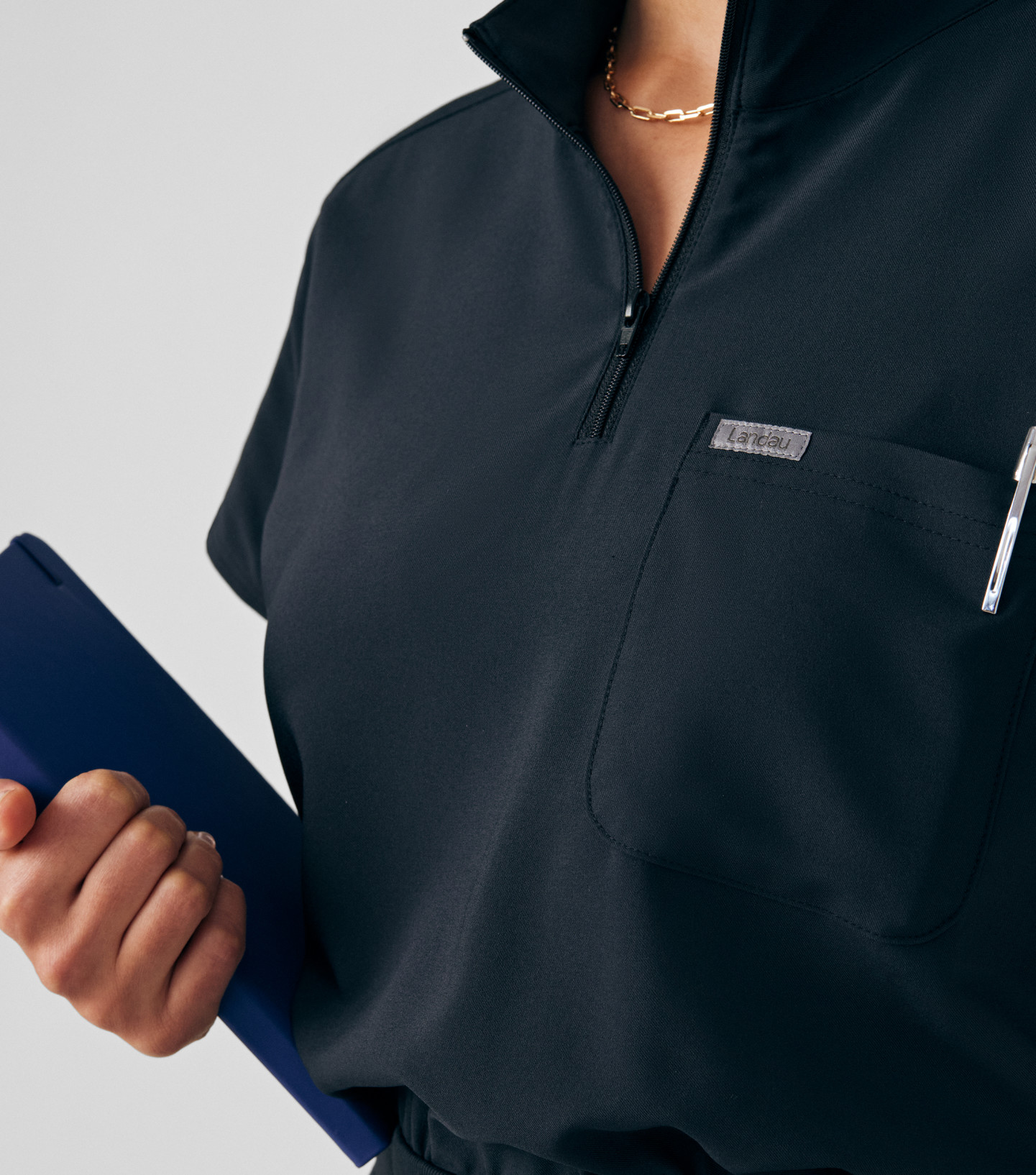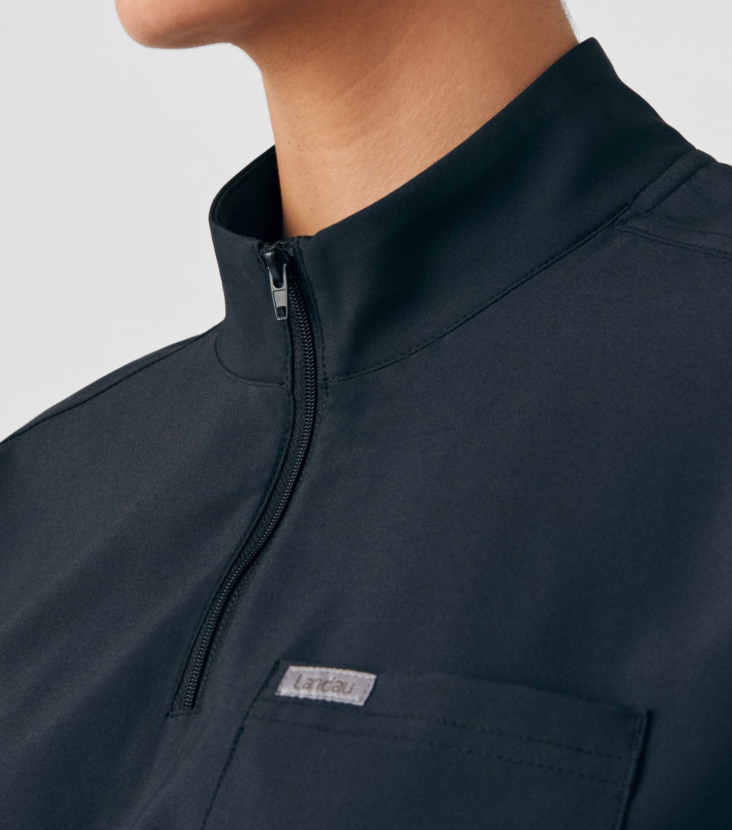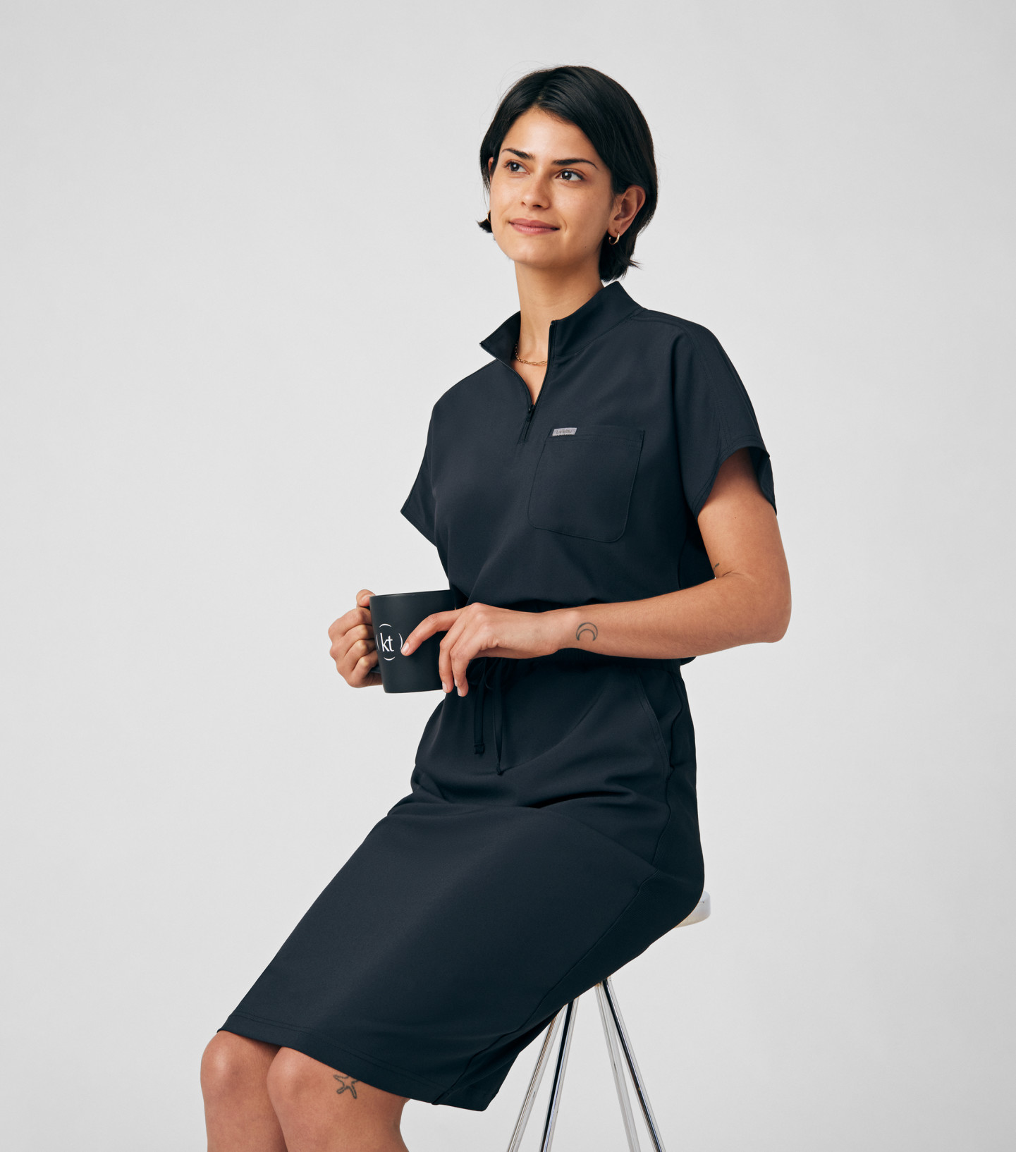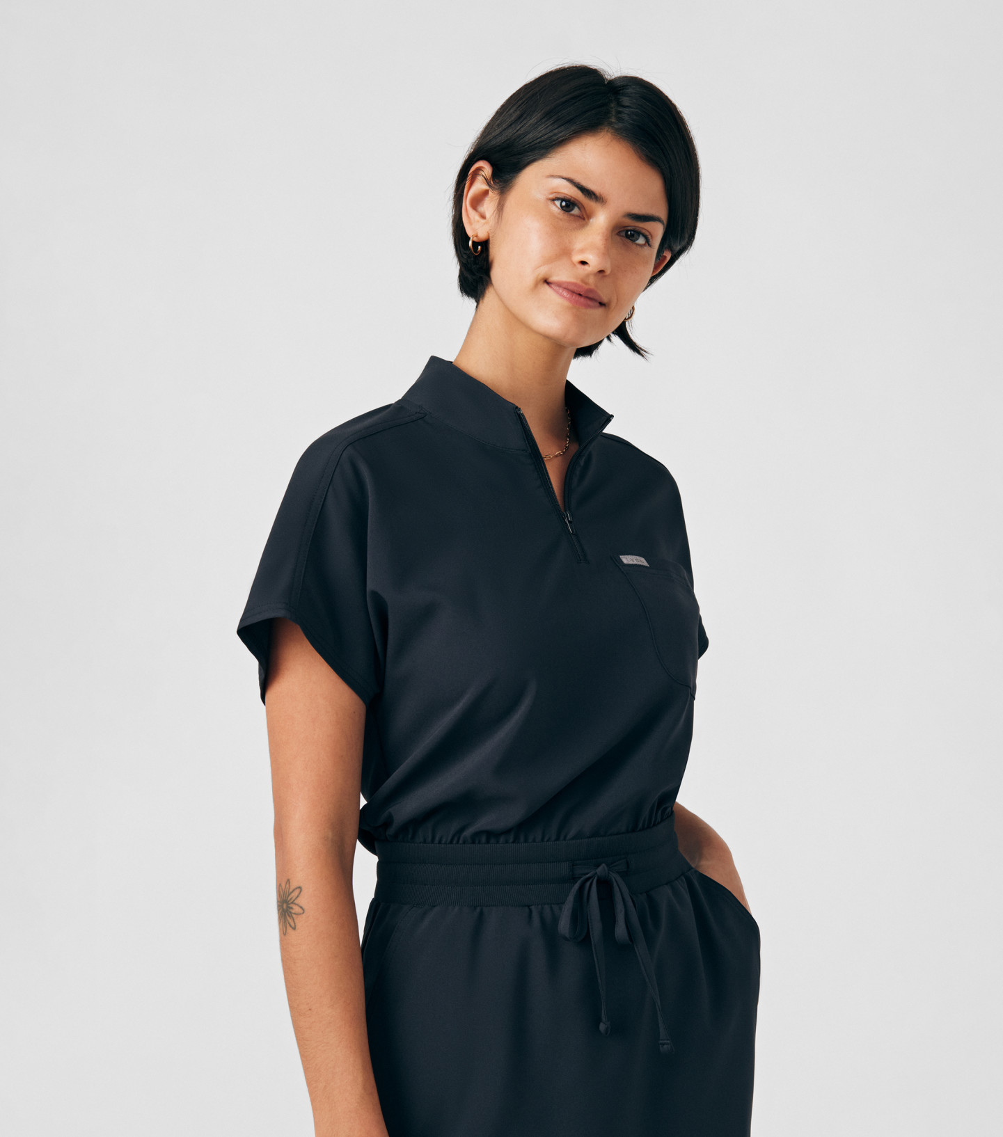 This contemporary scrub dress is perfect for medical professionals who want to look polished while enjoying ease and flexibility. Designed with practicality in mind, it features three spacious pockets — including a chest pocket and two diagonal front hip pockets — for convenient essentials storage. The versatile zipper closure at the collar allows you to wear it zipped up for a sleek look or open for a more casual feel. An elastic waist with an adjustable drawstring ensures a customized fit.